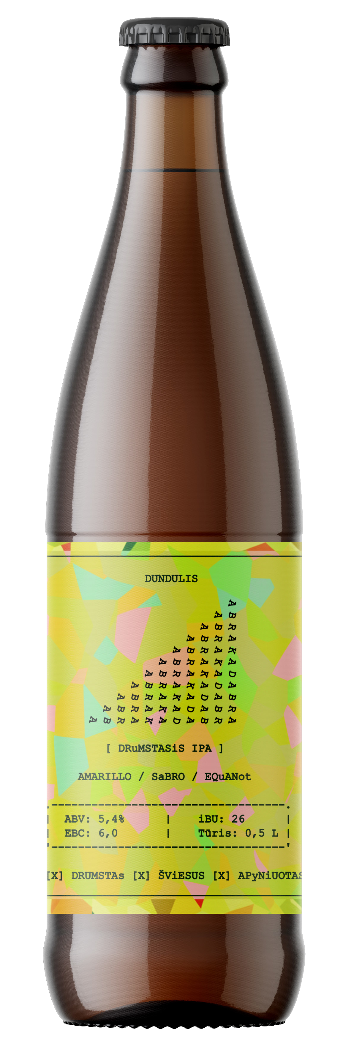 ABRAKADABRA – Dunduliui kiek nebūdingas, tačiau intriguojantis posūkis moderniųjų IPA stilių link – mūsų bandymas prisijaukinti drumstąją NEIPA. Vėlyvasis ir šaltasis apyniavimas AmarilloEkuanotSabro bei Idaho 7 apyniais sukuria žaismingą tropikų užtaisą: čia persipina citrusų, kokosų ir sultingų ananasų natos. Šį skonio profilį meistriškai išryškina Pomona bei London Fog mielės, o aksominį, drumstą kūną sukuria dosnus žiupsnis avižų ir kviečių.